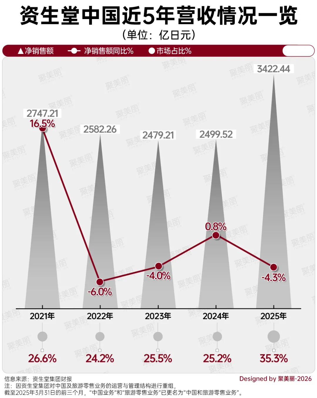 就上图来分析,资生堂中国在2022年、2023年分别下滑6.0%、4.0%,2024年微增0.8%的态势未能保持,如今2025年亦下滑4.3%。可见,资生堂集团在中国市场仍面临不小的挑战。