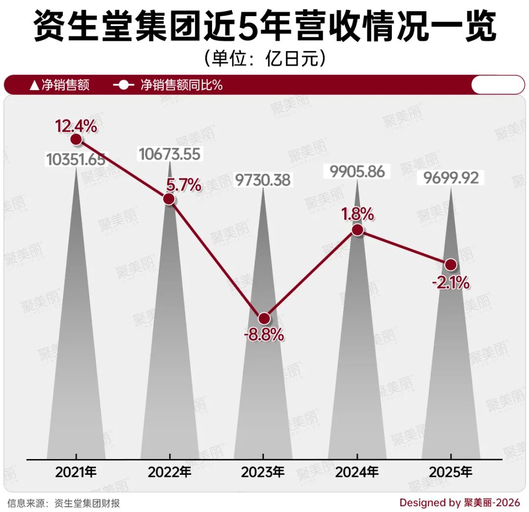 首先,拉长时间维度,纵观近5年资生堂集团的营收情况,可以发现,自2021年起,其已连续三年走“下坡路”,其中,净销售额同比增长由2021年的12.4%降至2022年的5.7%,到2023年已呈同比下滑8.8%,2024年虽微增1.8%,但在2025年同比下滑2.1%。