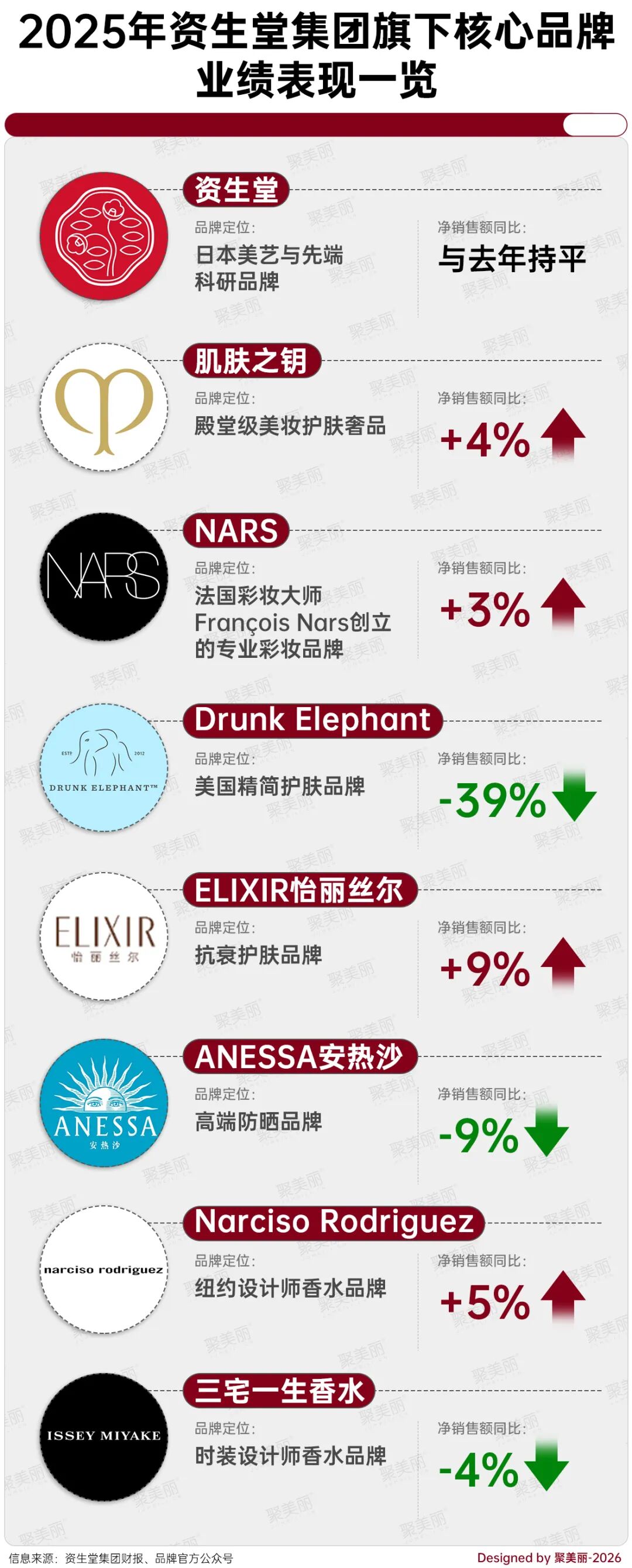 具体而言,Next 5品牌(即5大潜力品牌)中,2025年ELIXIR怡丽丝尔、Narciso Rodriguez净销售额分别增长9%、5%;此外,Drunk Elephant醉象则同比大跌39%,ANESSA安热沙、三宅一生香水分别下滑9%、4%。