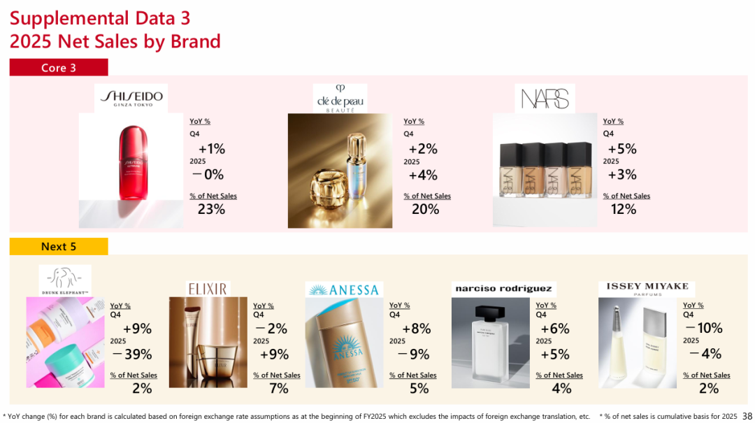 Core 3品牌(即3大核心品牌)中,2025全年,肌肤之钥、NARS净销售额分别增长4%、3%。其中,主品牌资生堂净销售额同比与去年持平。