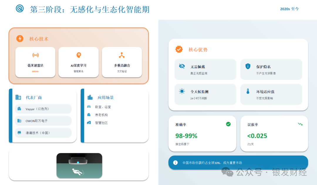 2020年至今,行业迈入AI无感监测与预防升级期,核心目标是“无感监测、精准识别、提前预防”。核心驱动力是AI深度学习与非接触式传感技术融合,产品扩展至居家无感设备、社区终端,可提前预警跌倒风险,将行业价值从“事后救援”延伸至“事前预防”。消费电子与科技巨头入局,形成“可穿戴+无感监测”双线格局,也推动技术主线进一步升级。