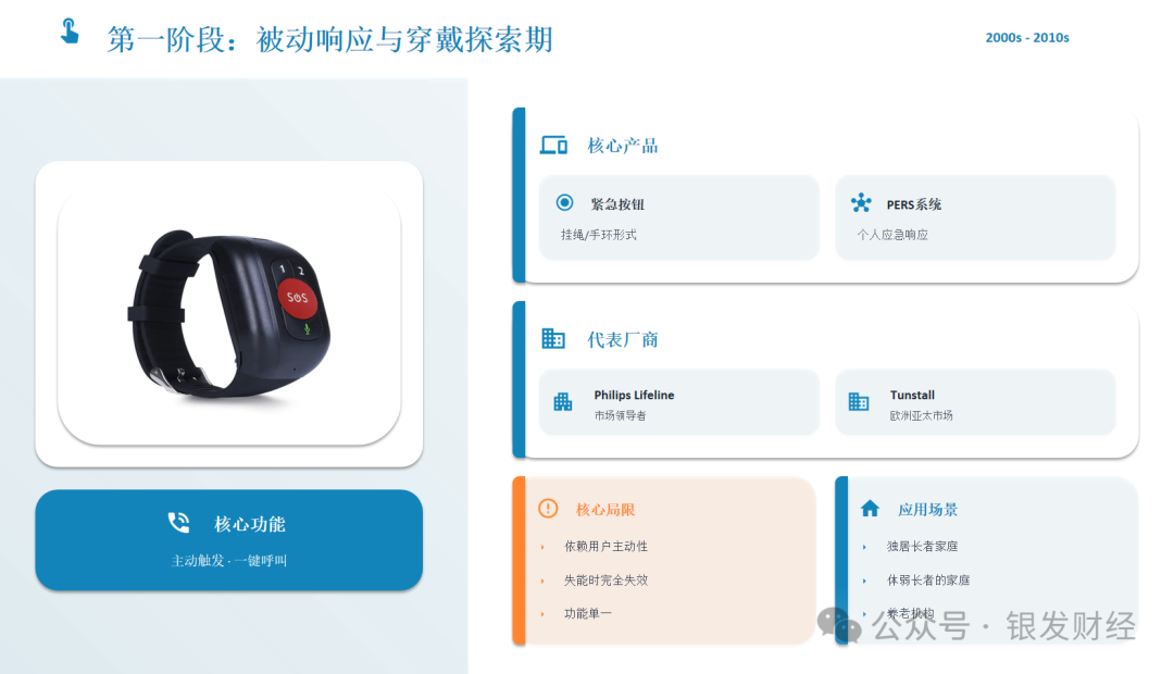 早期被动求助阶段,核心技术是通信技术的简单应用,产品依赖固定或2G移动网络传输求助信号,无传感与算法支撑,同质化严重,仅能实现“一键呼叫”,无法满足精准监测需求。