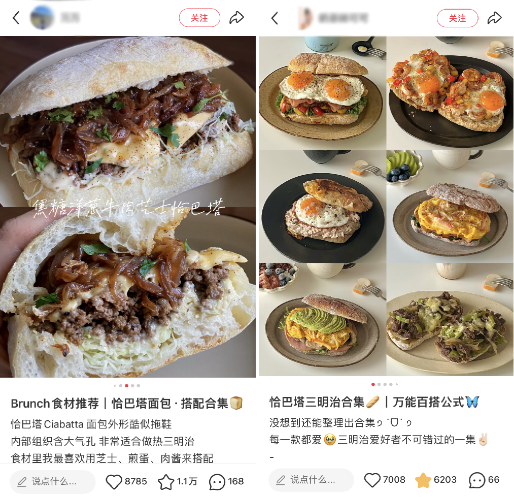 “10个博主拍brunch,9个都做过恰巴塔。”内容平台也在为恰巴塔的走红持续添柴,从经典的火腿芝士到酸菜牛肉、辣椒滑蛋等中式馅料,这些创意搭配为西式面包注入了本土灵魂,也让它成为DIY美食领域的常驻热门选题。目前,抖音话题#恰巴塔#相关视频播放量超10亿次,小红书上的相关笔记浏览量超5亿、讨论量超253万。