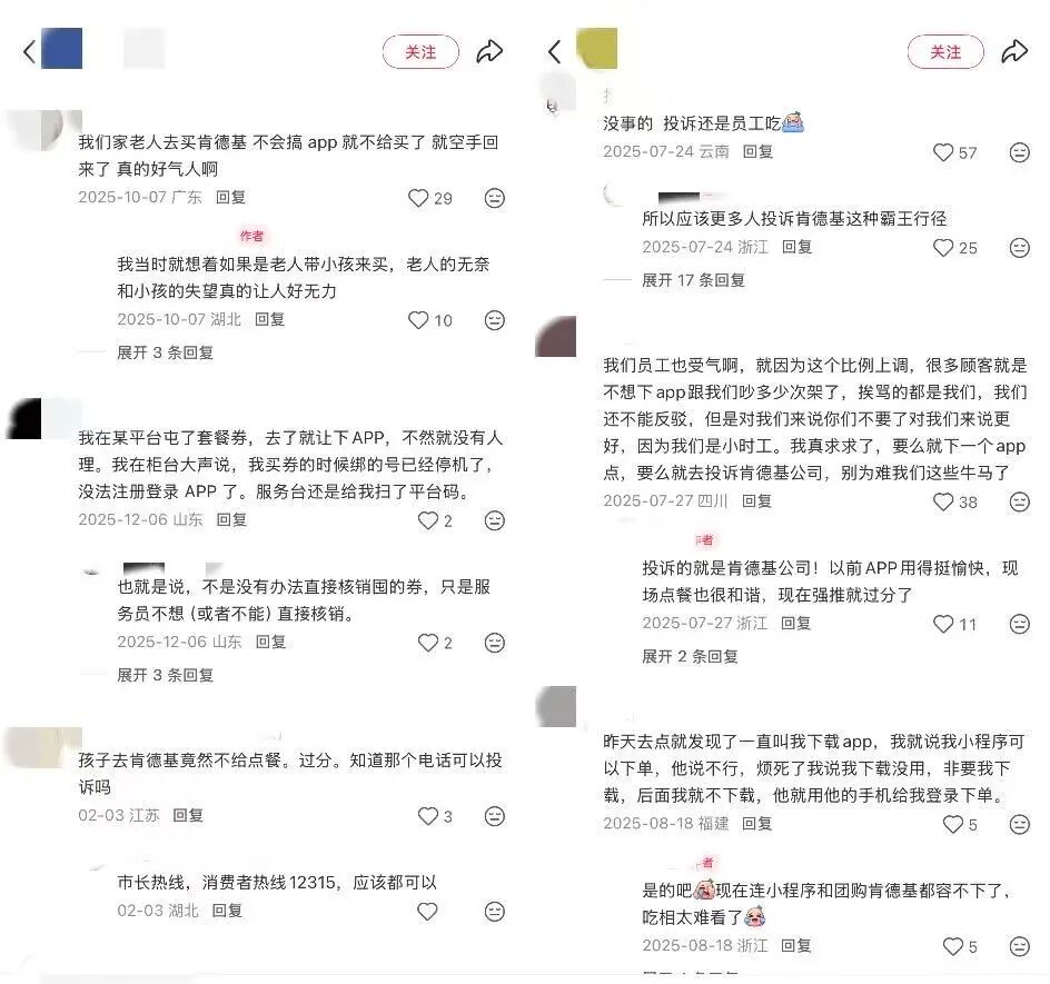 在社交平台,类似的讨论并不少见。一些消费者分享过被引导甚至强制下载APP的经历,甚至社交平台上有自称是肯德基店员的用户直言:不用APP,肯德基就宁可不赚这一单的钱。