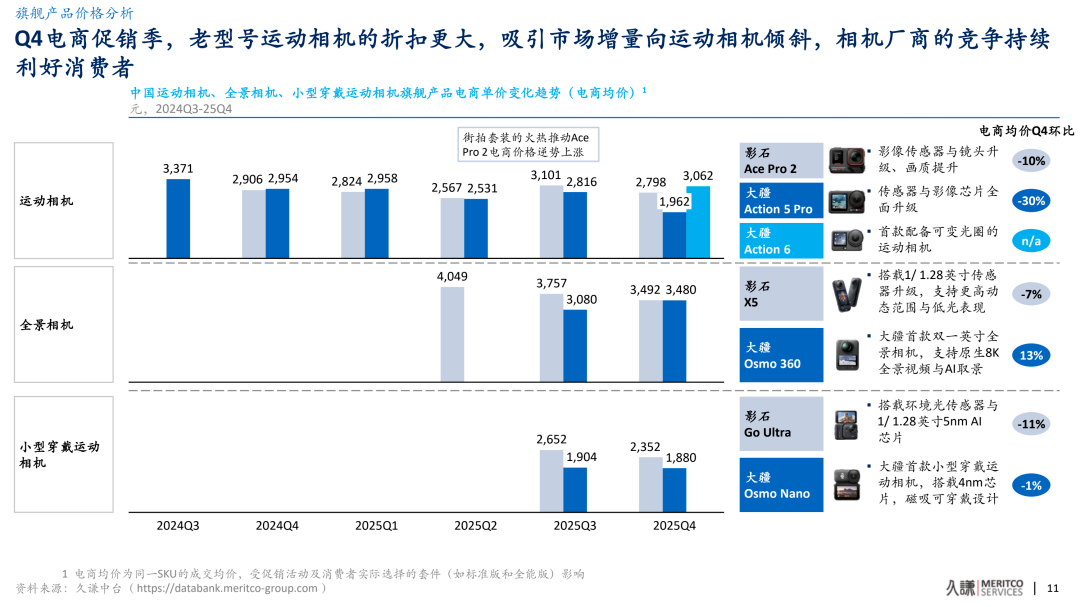 头部品牌围绕旗舰形成强势心智,但也在价格上展开直接竞争。体现在数据上,就是2025年Q4及之后,各家在电商促销期对旗舰机型给出了更大折扣,加上小型穿戴相机新品同步登场,同一品牌内部也出现了不同形态之间的自我竞争。
