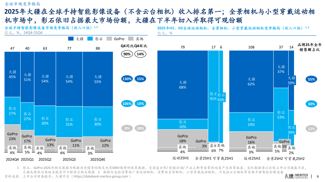 久谦研究显示,影石在全景和穿戴相机细分市场中占据了明显优势,同时在运动相机上份额有所抬升,整体市占率达到约30%,位居全球第二。
