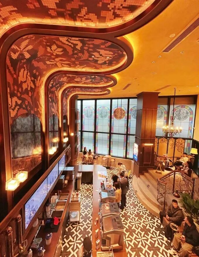 值得注意的是,该门店一改瑞幸惯用的蓝色系装修风格,转而走“老钱风”,门廊采用拱形设计、落地窗为彩绘样式、楼梯为吊水铁艺风格,整体充满设计感。不少粉丝直言:“瑞幸变高端了。”
