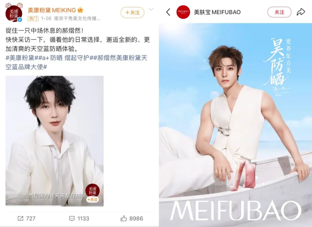 美康粉黛的防晒产品同样吃到一波代言人红利,在官宣郝熠然成为品牌大使的一小时内,全平台礼盒全部售罄,24小时内实现全渠道销售额超1700万,创下天猫防晒类目多个TOP1记录。