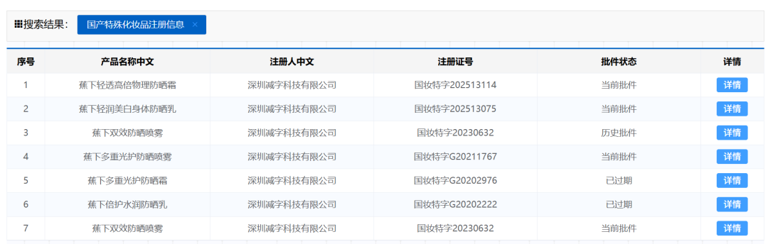 无独有偶,蕉下早在2020年也围绕防晒赛道布局美妆,2021年以防晒喷雾为切入点,并在天猫官方旗舰店上推出相关产品。据国家药监局显示,蕉下母公司深圳减字科技有限公司,已注册7类产品,其中4个产品为最新的有效批件,2025年新注册了蕉下轻透高倍物理防晒霜、蕉下轻润美白身体防晒乳两种产品。