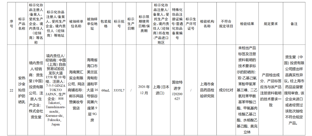 更重要的是,在多次通告中特别提及的涉嫌假冒产品中,防晒成“制假重灾区”,尤其是在中国有极高用户基础和知名度的资生堂旗下品牌,共有18批次的产品在检查过程中被假冒,其中安热沙金灿倍护防晒乳出现频率最高。