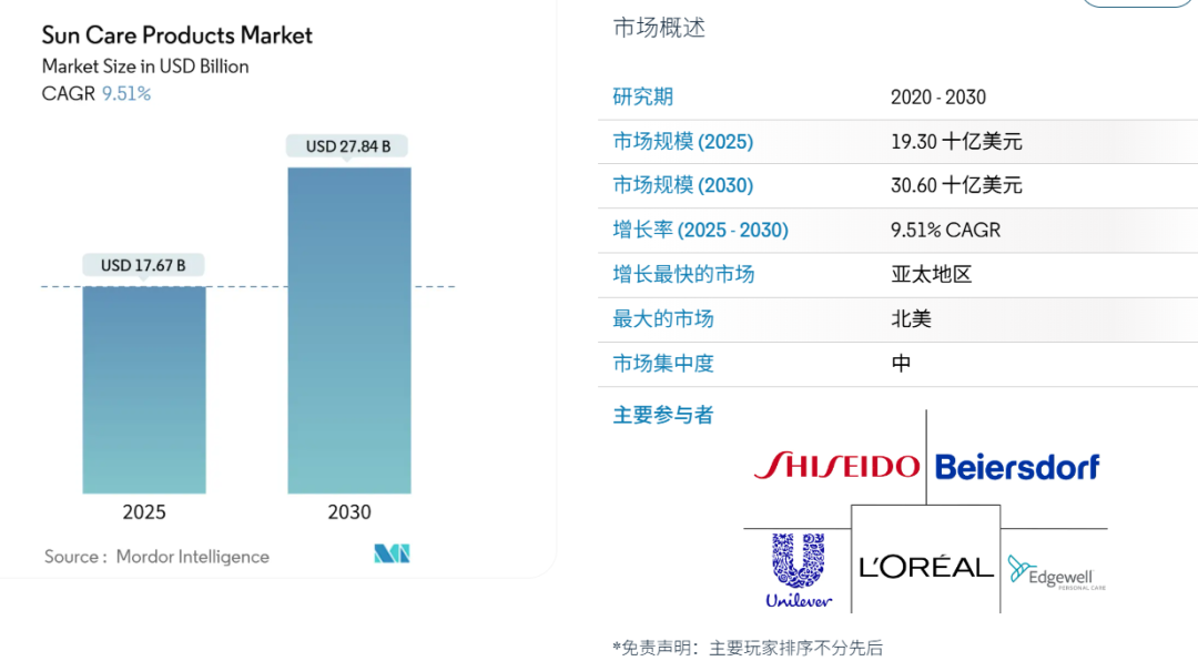 据Mordor Intelligence相关数据显示,2025年全球防晒市场规模达193亿美元(人民币约1341.6亿元),以9.51%的增速发展,预计2030年达到306亿美元(人民币约2127.1亿元)。其中,亚太市场成为增长最快的区域,这也意味着,在一众品类普遍增速放缓的情况下,防晒这一细分赛道仍然存在潜力。