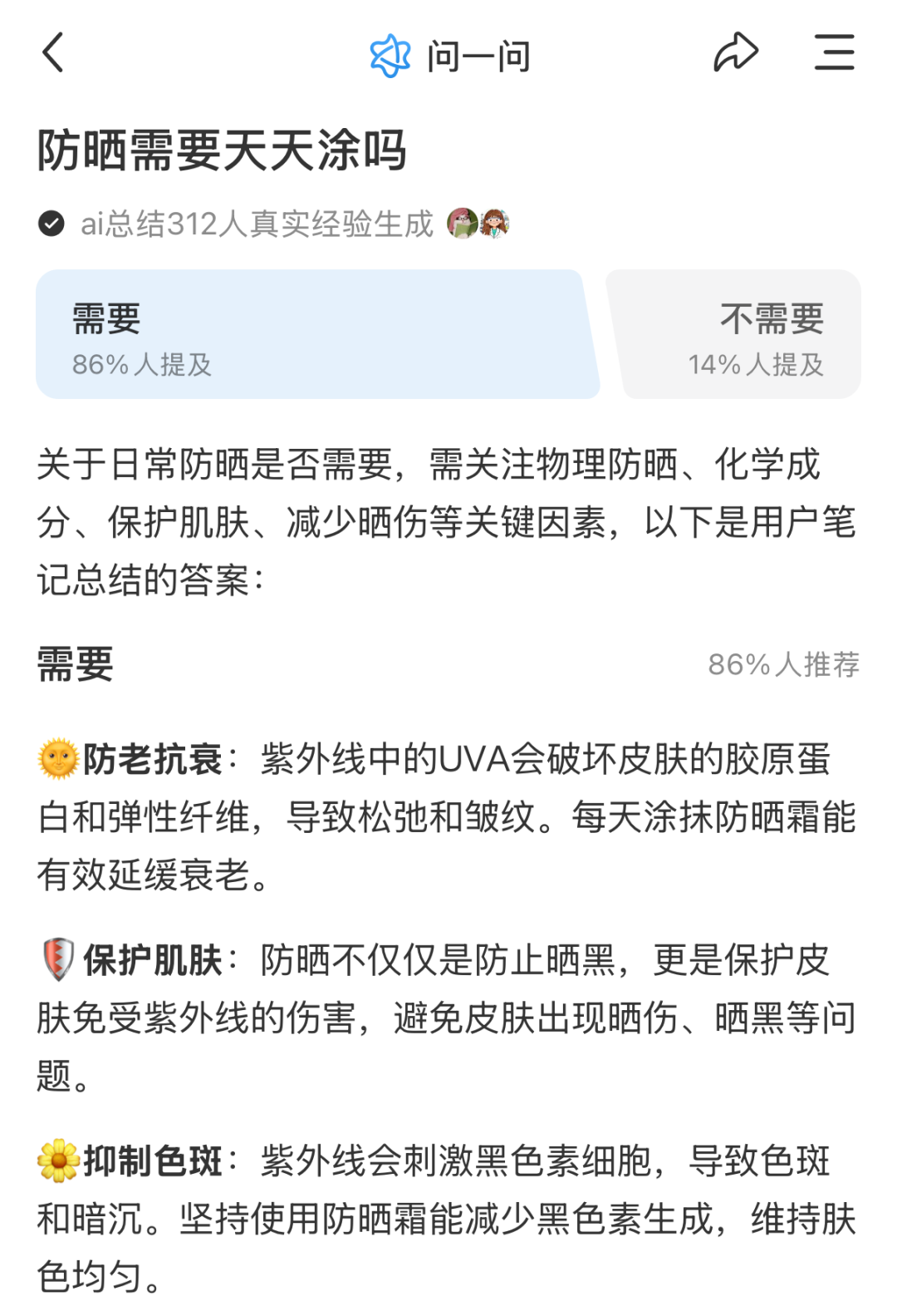 不过,据小红书ai总结的真实经验中显示,86%的用户表示出于防老抗衰、抑制色斑等原因,需要天天涂防晒。