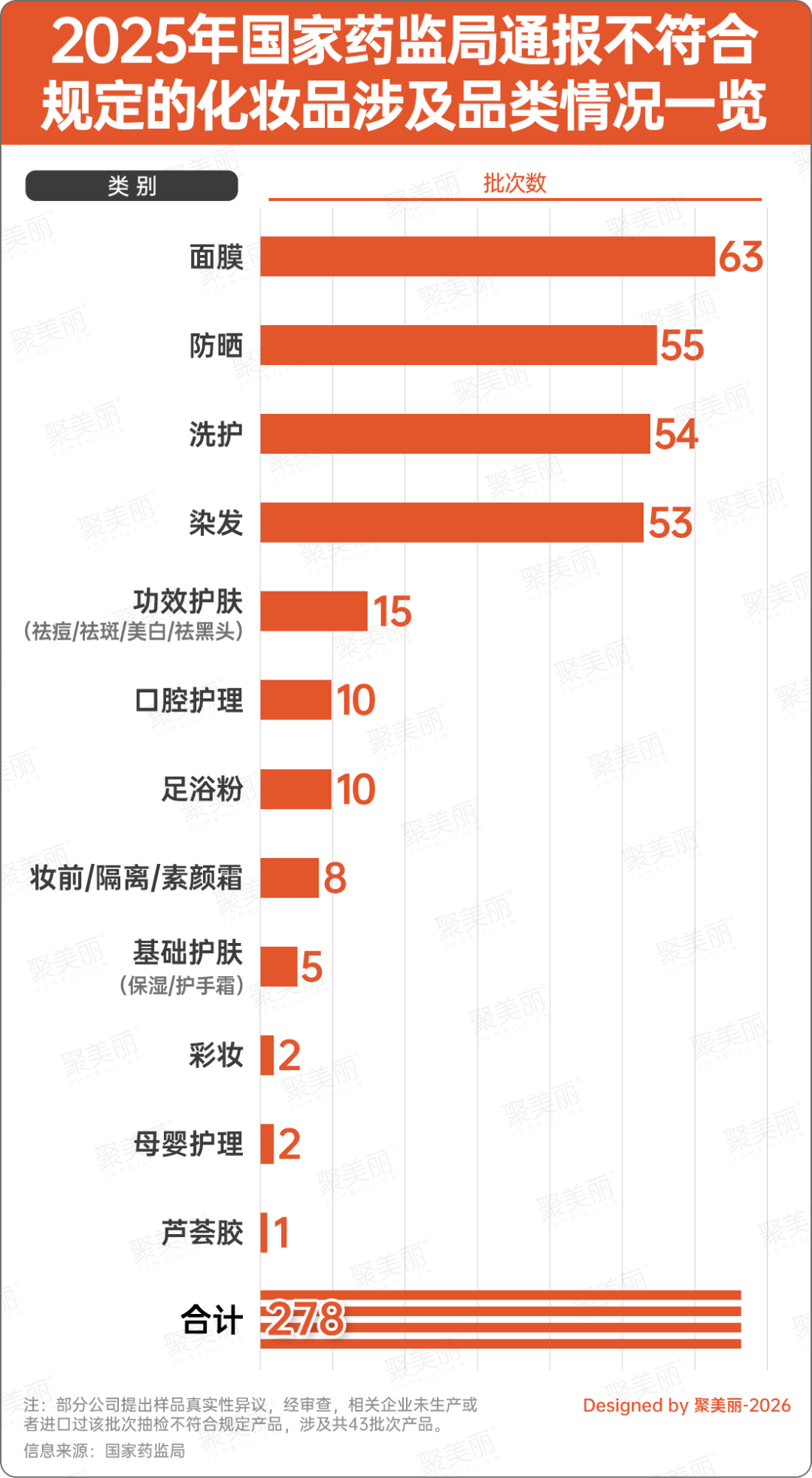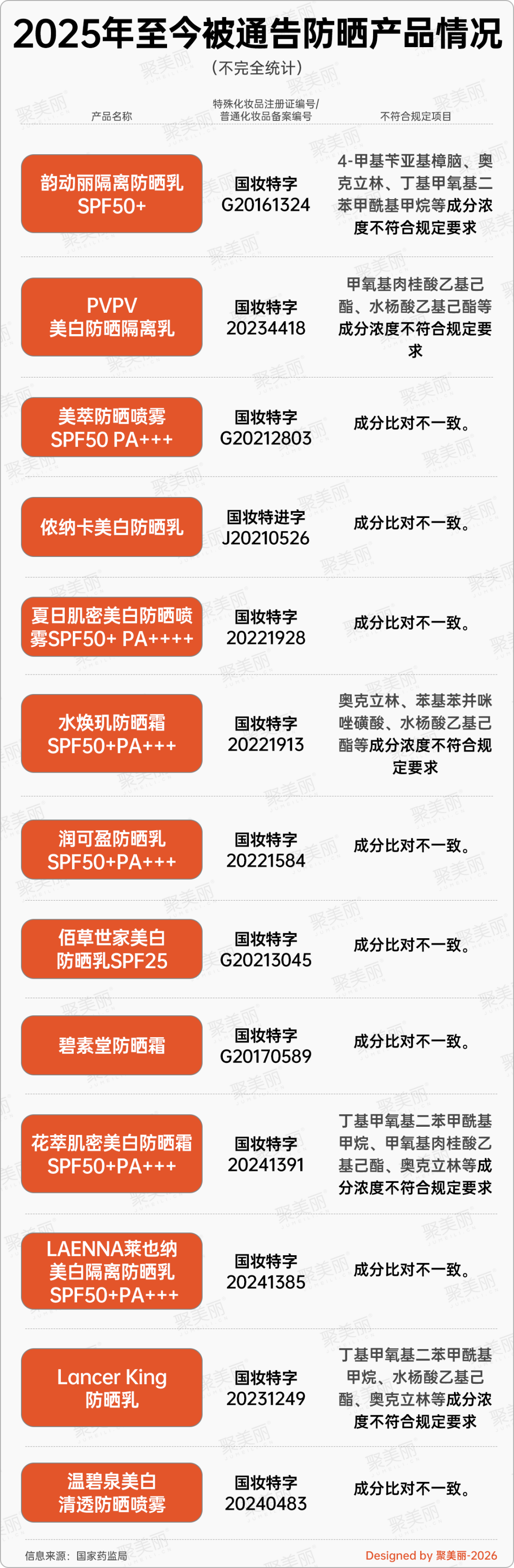 据聚美丽此前统计梳理,在2025全年国家药监局的所有通告当中,防晒类产品达55批次不合规,数量位居第二大品类,仅次于面膜类产品。
