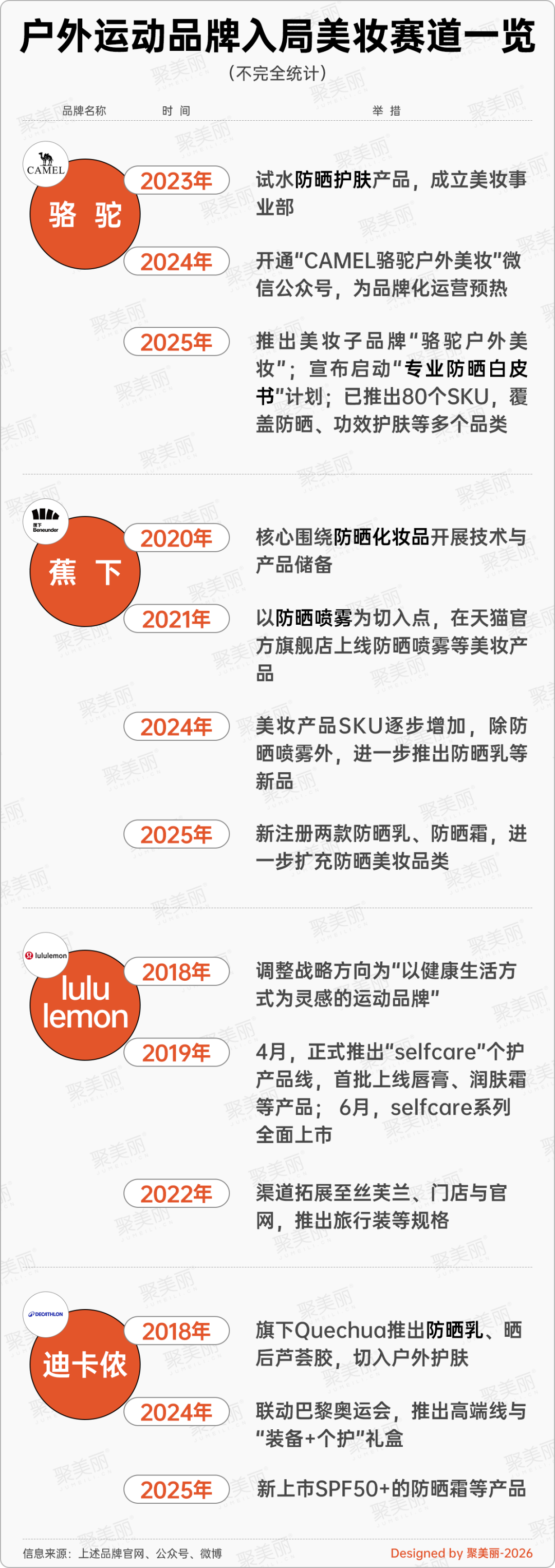 如骆驼于2023年成立美妆事业部,两年后,推出美妆子品牌“骆驼户外美妆”,该品牌聚焦抗光老修护领域,主打户外美妆细分赛道。截至2025年,其美妆线已推出80个SKU,涵盖防晒、功效护肤等多个品类。