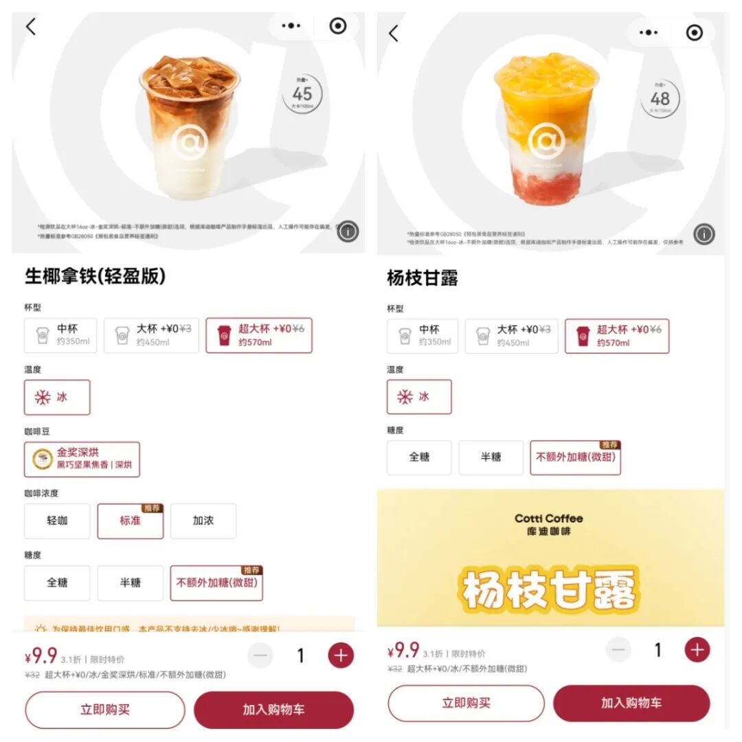 更值得关注的是,库迪采用无门槛、不限量、无套路的设定:用户无需抽奖、拼手气,进入库迪App或小程序的“特惠专区”,即可直接以9.9元购买超大杯饮品,活动覆盖生椰拿铁轻盈版、杨枝甘露、金奖美式等6大高频爆款,精准匹配大众日常消费需求。