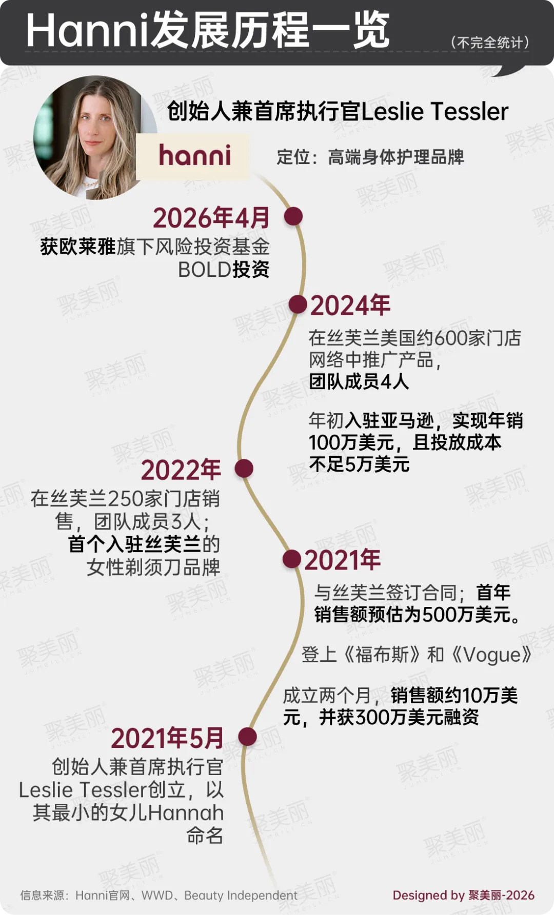 梳理品牌发展历程可知,Hanni在2021年5月诞生于美国,由前欧莱雅市场主管(曾任职于卡诗、植村秀专业美发、植村秀护肤及彩妆线等)Leslie Tessler创立,其为创始人兼首席执行官。