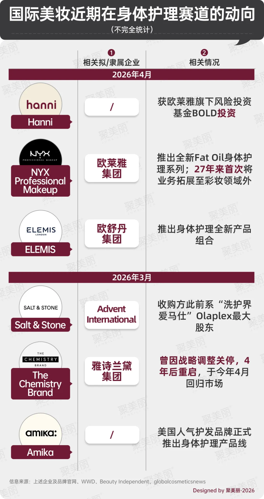 当然,如开头所述,盯上身体护理的并非只有欧莱雅集团,聚美丽根据公开资料梳理发现,雅诗兰黛集团、欧舒丹集团等国际美妆巨头也在布局身体护理赛道。
