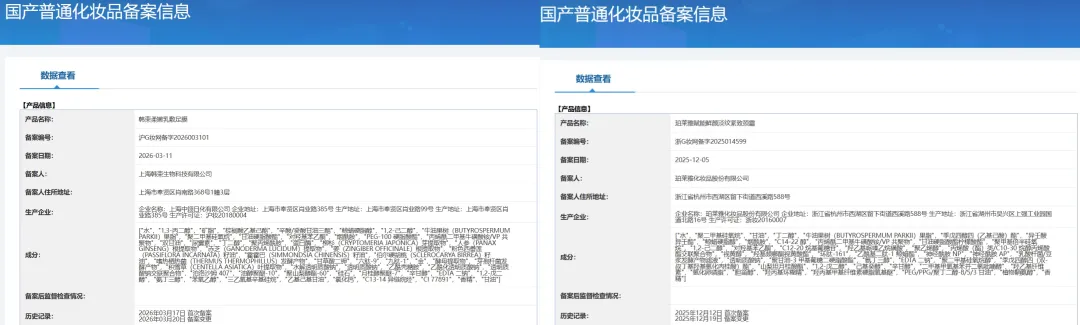 另一方面,头部国货美妆企业通过备案新品的形式加速入场。譬如,据国产普通化妆品备案信息显示,2026年3月,韩束备案了一款新品“韩束柔嫩乳敷足膜”,此前还备案了首款颈部护理产品“黄金肌肽紧致抚纹颈膜”及5款不同香型的护手霜;珀莱雅集团则于2025年12月备案“赋能鲜颜淡纹紧致颈霜”……
