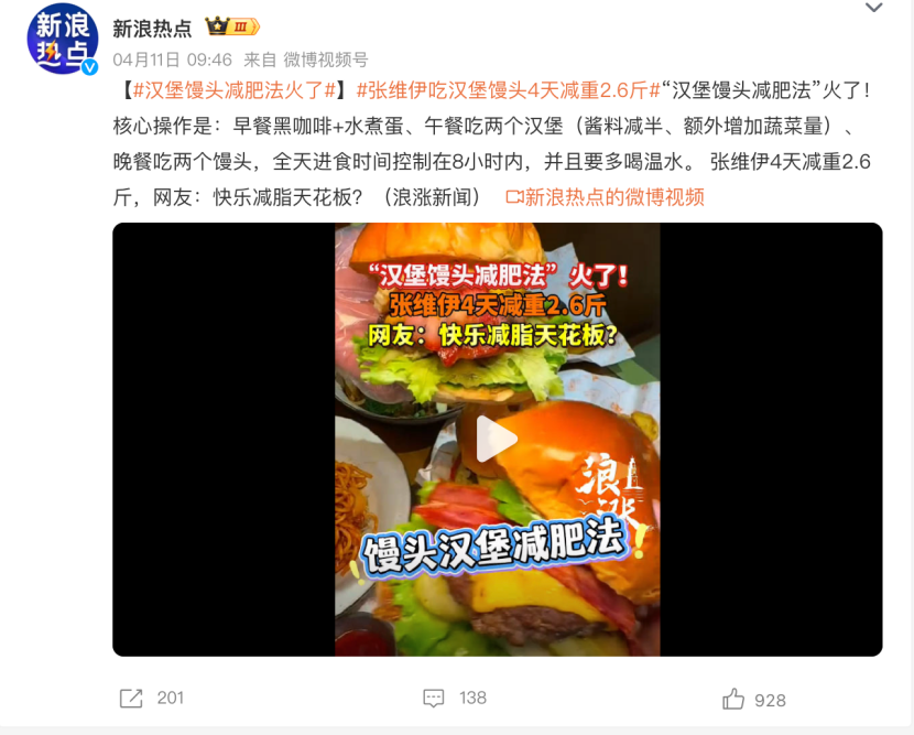 近日,演员张维伊靠“汉堡配馒头”4天减重2.6斤的新闻冲上热搜。这套方法的核心操作是:早餐黑咖啡加水煮蛋,午餐吃两个酱料减半、多加蔬菜的麦当劳汉堡;晚餐则只吃两个馒头,不再吃其他任何东西。