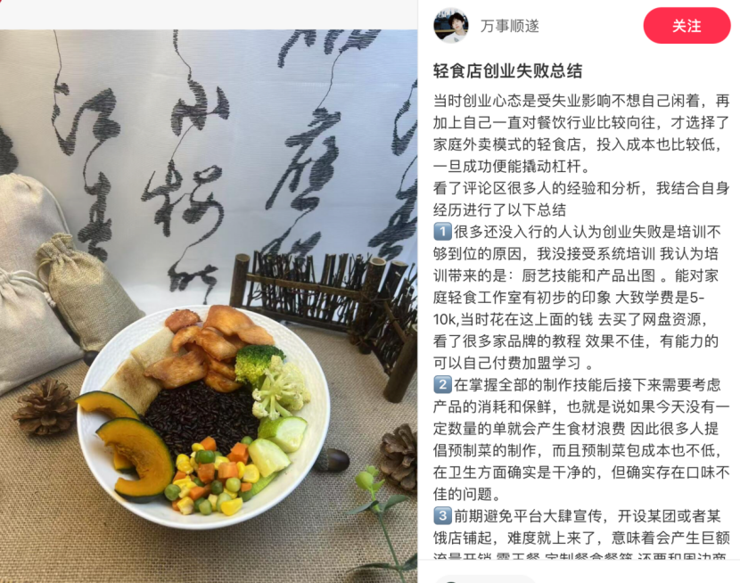 餐饮业者闻听“轻食”二字,更是如临大敌。此前,曾有创业者连线@勇哥餐饮创业 咨询轻食店选址,但包括主播本人及直播间几千位观众均不看好,“勇哥”更是直言:“除非回到十年前,那时候你做轻食,去北上广随便都能拿到融资。”