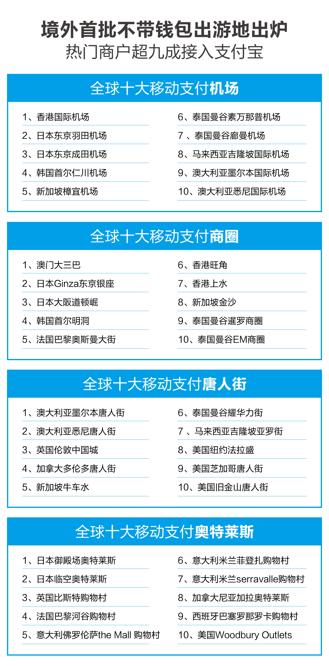 十一小长假进入倒计时,今天,全球移动支付十大机场、十大商圈、十大中国城、十大奥特莱斯联合宣布:旗下热门商户超九成支持支付宝付款,中国游客来了,可以不带钱包。