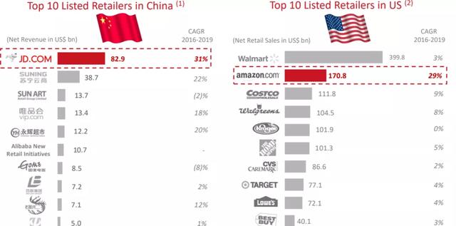 京东的财报里,对自己的定位是零售商,国内营收排名第一,跟随其后的是苏宁云商、高鑫零售、唯品会和永辉超市。而在国外,同一赛道的选手有沃尔玛、亚马逊、Costco,其中京东对标的则是亚马逊。