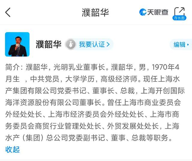 光明乳业的高管频繁变动,包括董事长、总经理、财务总监等要职。光明乳业现任董事长是2018年接任的濮韶华,据天眼查APP显示,除了任光明乳业董事长,濮董其他工作经历与乳业市场并无关系。