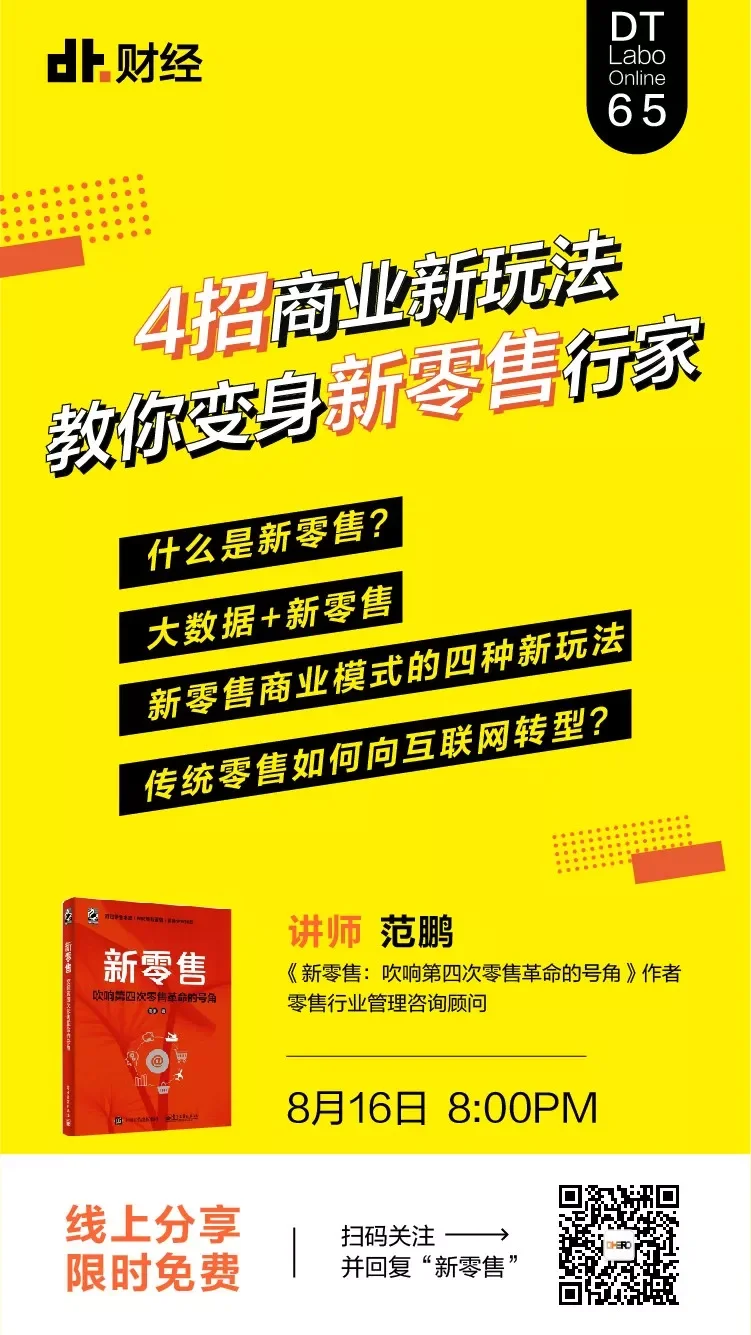 DT君将携手《新零售:吹响第四次零售革命的号角》的作者范鹏老师,从“新零售”的诞生、商业模式的分析、到真实案例的探讨,带你一同探索“大数据如何赋能新零售”。敬请期待!